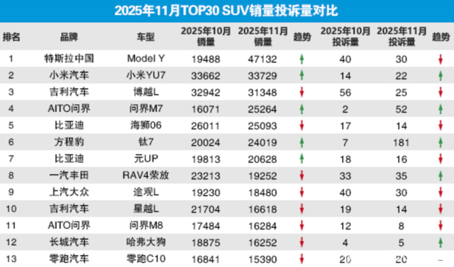 特斯拉Model Y无疑是11月的现象级产品。其销量环比暴涨,以47132辆的优势重夺中型SUV乃至整个细分市场的冠军,这一强势反弹,印证了整车通过价格与产品力调整后依然强大的市场号召力。然而在销量陡增的同时,其投诉量也位居前列,部分新车主对产品细节或软件体验的更高期待有关。